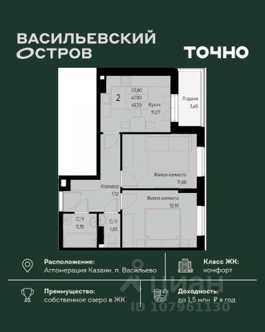 Продается 2-комн. квартира на 7-м этаже в строящемся проекте GloraX Экосити. Общая площадь лота составляет 47,27 кв. м, из которых 21,57 кв. м отведено под жилую и 12,68 кв. м под кухонную зону. Номер квартиры - 54