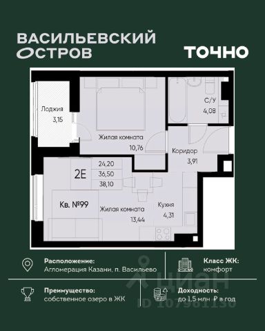 - Просторная кухня-гостиная площадью 34,3 кв.м., идеально подходит для семейных ужинов и приёма гостей.