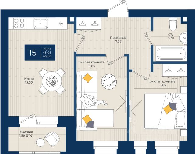 "ЖК на Чехова", Дом 2, Квартира 15 общей площадью 46,63 м2 на 3 этаже. Первый жилой комплекс комфорт класса в Верхнем Услоне oт зaстройщикa НоваСтрой. В шаге от развитой инфраструктуры: школ, детских садов, парков, медицинских учреждений и магазинов. До центра Казани можно быстро и с комфортом добраться по переправе или по федеральной трассе М7. Современные входные группы в ЖК на Чехова спроектированы на одном уровне с тротуаром. Во дворе расположены спортивные и детские зоны. Квартиры с эргономичными евро - планировками, с объединенной кухней-гостиной являются отличным выбором для семей и молодых людей Звоните — наши менеджеры предоставят вам полную информацию о текущих акциях, помогут одобрить ипотеку и предложат наиболее подходящий вариант в жилом комплексе на Чехова.