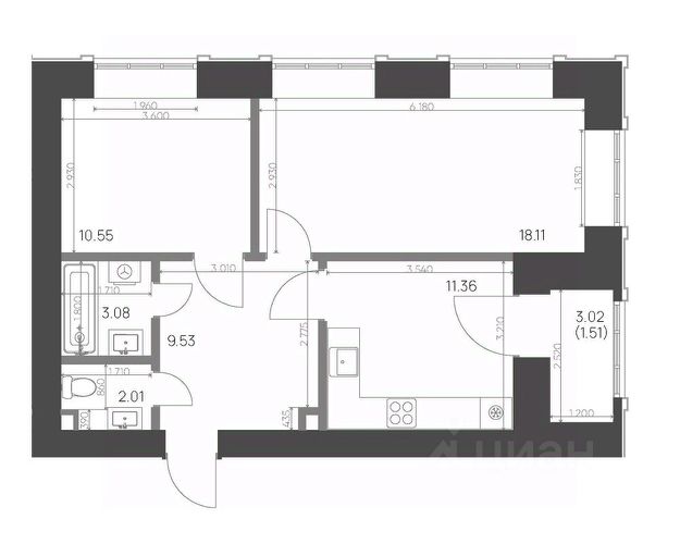 Уютная квартира для небольшой семьи Функциональная кухня Просторная спальня с возможностью выделения гардеробной и рабочей зоны, а также выходом на лоджию Прихожая с нишей под шкаф Вместительная ванная Высота потолков 2,7м Улучшенная предчистовая отделка