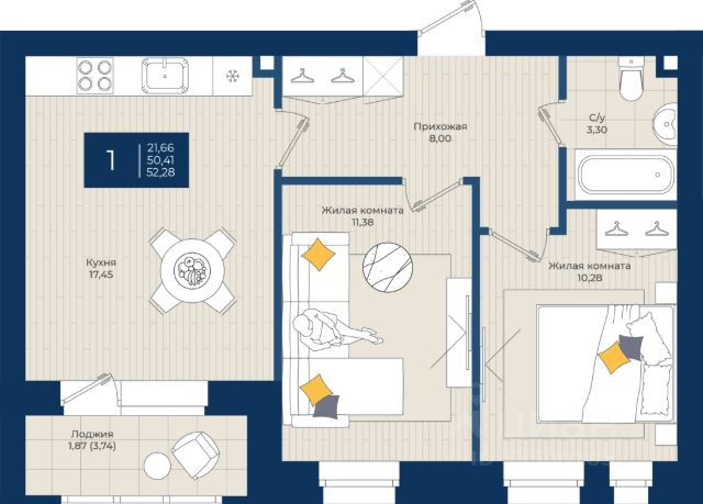 Продаётся 2-комнатная квартира в строящемся доме (дом 1), срок сдачи: III-кв. 2026, общей площадью 52.28 кв.м., на 1 этаже.