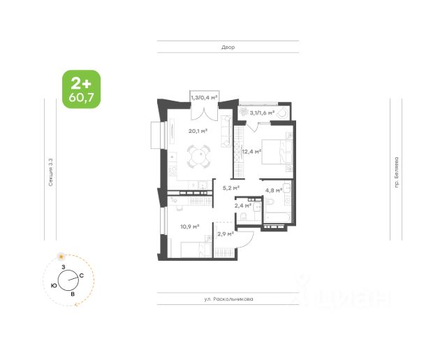 Продаётся 2х комнатная квартира в самом благоустроенном районе города. ЖК Притяжение. 57.2 кв.м, 2этаж.