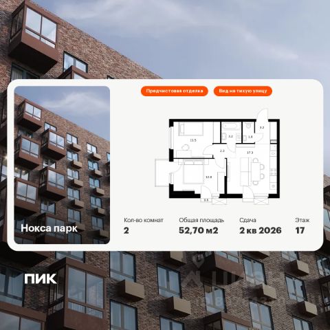 Продаётся 2-комн. квартира площадью 53,2 кв.м на 14 этаже 17 этажного дома (Корпус 9, Секция 1) проекта ПИК Нокса парк. Светлый просторный подъезд на уровне земли, функциональная планировка, большие окна, предчистовая отделка.
