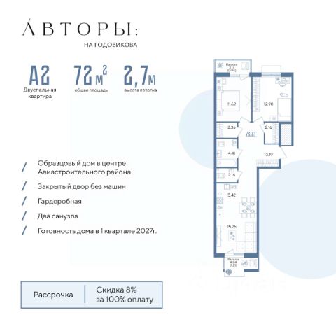 Вы можете приобрести эту квартиру в ипотеку с первоначальным взносом от 20% и со ставкой от 5,9% для всех, а не только по семейной программе. Подробнее - звоните! Продается 2-к квартира 36 в образцовом доме "Авторы на Годовикова" в центре Авиастроительного района. Квартира на 2 этаже площадью 67.67 м², кухней-гостиной и высотой потолков 2.7 м. Квартира сдается в предчистовой отделке со стяжкой полов, предоставляя полную свободу для ваших предпочтений в дизайне. Срок сдачи дома — 1-й квартал 2027 года. Возможно приобретение со скидкой 8% при полной оплате(акция действительная до 31.07.2026г.), в рассрочку с первым взносом 30%, а также оформление стандартной ипотеки по интересным условиям. Образцовый дом "Авторы на Годовикова" расположен в тихой зоне, удаленной от активной дороги — на второй линии от улицы Максимова. Соседство с невысокими частными домами открывает превосходный вид из квартиры. Для прогулок на свежем воздухе в шаговой доступности Караваевский парк и парк "Крылья Советов". В соответствии с современными стандартами комфорт-класса "Авторы" предлагают особые решения для вашего комфорта: • Современная архитектура. • Закрытый двор без машин. • Дизайнерские холлы с зонами ожидания и детской комнатой. • Подземный паркинг. • Зона для хвостатых. Двор в концепции траектории полета создает единую линию движения. На территории дома есть многофункциональная зона для йоги и настольных игр, детская зона для комфортных прогулок юных жителей, многофункциональная спортивная площадка со скалолазанием и площадка для выгула собак. Обильное озеленение из 25 видов растений и несколько игровых зон для юных жителей разных возратов: для детей до 3-х лет — песочница, горка и качели; для детей от 4 до 14 лет — большой игровой комплекс, включающий горки, качели, карусели, переговорные трубы и мягкую геопластику, в которой прячутся тоннели. Компания "Авторы" — девелопер на рынке высококлассной недвижимости Казани. Как самостоятельный застройщик компания работает с 2022 года, а в начале 2024 года успешно сдали свой первый проект ЖК "Дом у озера", где 96% квартир были приняты дольщиками с первого раза и без критичных замечаний. Компания входит в ТОП-5 застройщиков РТ по потребительским качествам ЕРЗ. Сейчас компания ведет строительство проектов на ул. Большая, ул. Петербургская, ул. Годовикова и ул. Астрономическая