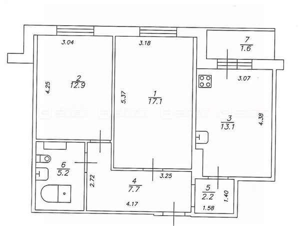 Зал: 26,7 м² с двумя окнами, выход на балкон с видом на проспект Победы. Квартира не угловая. При желании зал можно разделить на две комнаты
