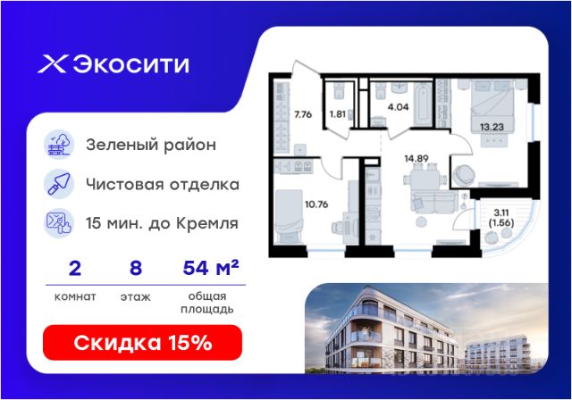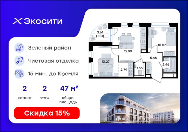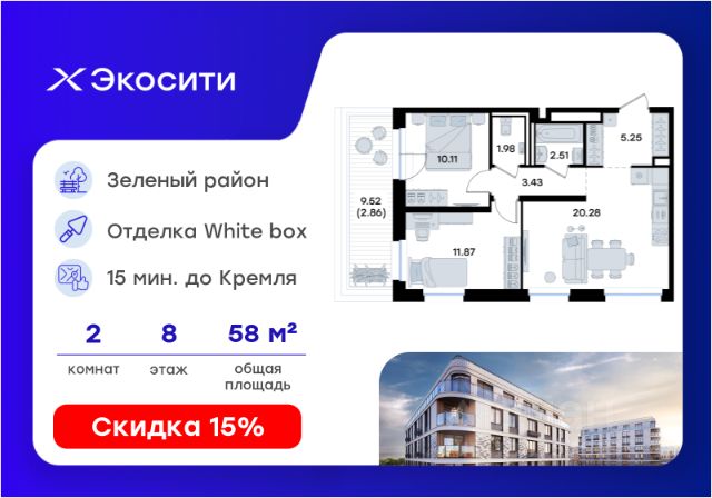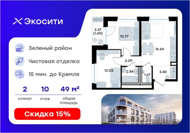 Продается 2-комн. квартира на 2-м этаже в строящемся проекте Экосити. Общая площадь лота составляет 49,92 кв. м, из которых 20,80 кв. м отведено под жилую и 14,34 кв. м под кухонную зону. Номер квартиры - 64 Преимущества квартиры в Урбан-квартале: • Квартира с полностью чистовой отделкой. В комнатах и коридоре: - натяжной потолок, - стены оклеены обоями под покраску, - полы: ламинат, плинтусы и напольная плитки - установлены межкомнатные двери и подоконники. В санузлах: - на стенах - керамогранитная плитка и/или окраска водостойкой краской - на полу - керамогранитная плитка; - натяжной потолок - сантехника: ванна и экран под ванну/душевой поддон, унитаз, раковины и смесители, монтаж водопровода и канализации - Предусмотрен расширенный пакет системы Умный Дом: бесключевой доступ в подъезд, видеодомофон с функцией Face ID, видеонаблюдение, автоматизированный сбор и передача показаний счётчиков; - На территории Урбан-квартала предусмотрено строительство детского сада на 360 мест, школы на 1501 место, детский развивающий центр на 2000 мест. - Рядом с с кварталом Резиденции запланировано строительство детского сада на 360 мест, школы с детским развивающим центром на 1501 место - На первых этажах домов Урбан-квартала запроектированы коммерческие помещения - предусмотрены места для супермаркетов, бытовых услуг, кафе. - Собственный комьюнити-центр для жителей Урбан-квартала - Клуб Резидентов для жителей квартала Резиденции - бульвар "Река между камней" с плейхабом для детей, амфитеатром, спортивными зонами, аллеей достижений. Всем посетителям будет доступен иммерсивный маршрут и AR-игры. - Тайная тропа вдоль которой расположатся зоны тихого отдыха, йоги и медитаций - 2 смотровые площадки - Снейк-ран - Круговой спортивный маршрут - Специальные зоны для выгула собак - В Урбан-квартале предусмотрено строительство 2 многоэтажных паркингов на 300 и 360 машиномест. Всем жителям проекта доступен и привычный плоскостной паркинг вокруг территории проекта с возможностью в приложении дома получить информацию о наличии парковочных мест. - В квартале Резиденции предусмотрен подземный паркинг на 260 машиномест Экосити — это совершенство города в первозданной природе. Наполненный возможностями квартал, в котором вы не выбираете между городом или природой, семьей или работой, отдыхом или спортом, — вы берете всё сразу. Каждая семья, каким бы составом она ни жила, найдет для себя идеальное пространство. Планировочные решения разнообразны, также как и возможности отделки от черновой до полностью с ремонтом. Здесь запроектированы квартиры с просторной кухней-гостиной, чтобы семья могла комфортно проводить время вместе. Квартиры сдаются с современной качественной отделкой, что позволяет после сдачи дома сразу начать жить, избежав долгих самостоятельных ремонтов. Цветовые решения и стиль отделки можно выбрать при покупке квартиры. Резиденции сдаются в черновой отделке, вы могли реализовать ваши самые смелые дизайнерские решения. Каждая резиденция это база