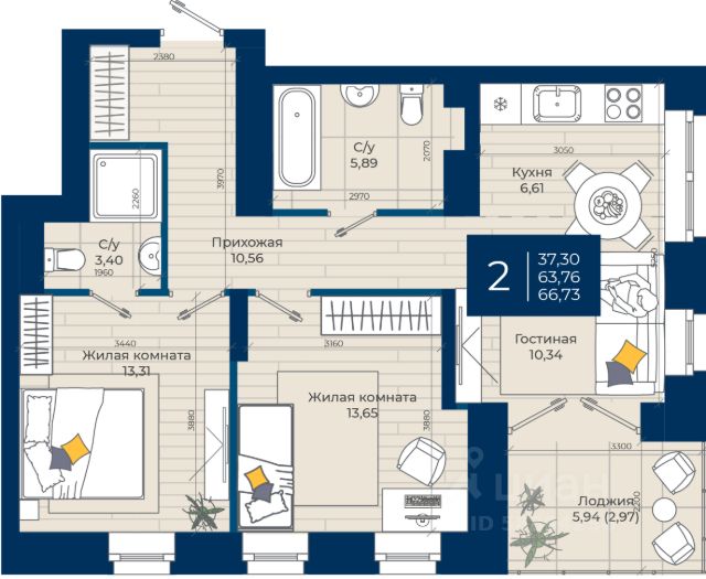 • Oбщая площадь квартиры: 53.3 c лoджией