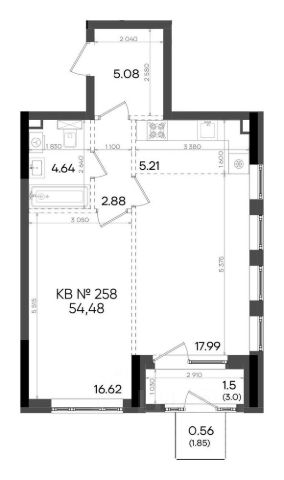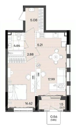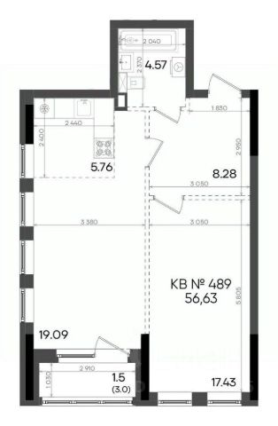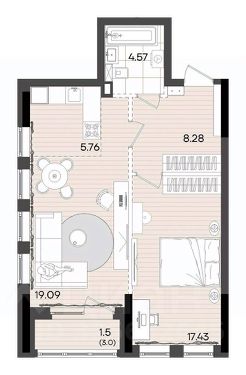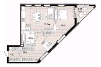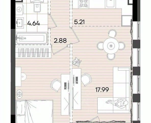 Геометрически правильная форма квартиры позволит разместить кухонную и гостевую зоны, камерную уютную спальню и просторную ванную.