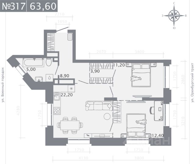 Квартира площадью 59 кв м, хороший этаж, лучшая планировка среди двухкомнатных квартир в данном доме.