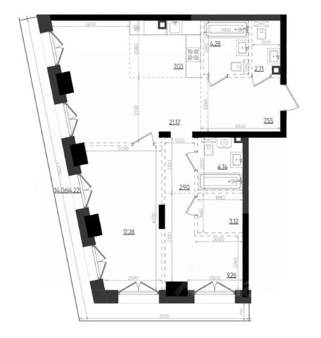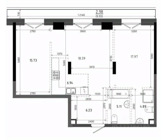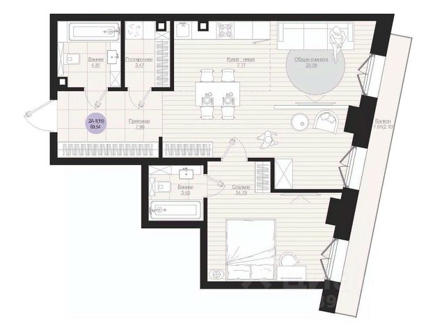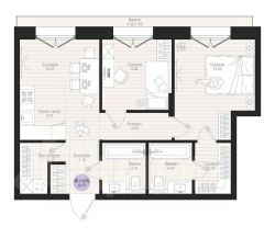 Общая площадь - 71,98 м2.Гостиная - 17,74 м2.