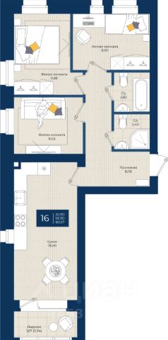 Продаётся 3-комнатная квартира в строящемся доме (дом 1), срок сдачи: III-кв. 2026, общей площадью 60.57 кв.м., на 3 этаже.