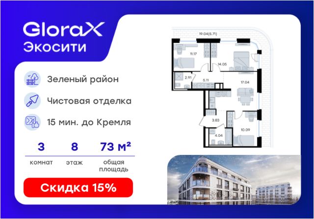 Продается 3-комн. квартира на 8-м этаже в строящемся проекте GloraX Экосити. Общая площадь лота составляет 71,53 кв. м, из которых 37,06 кв. м отведено под жилую и 16,36 кв. м под кухонную зону. Номер квартиры - 401 Преимущества квартиры в Урбан-квартале: • Квартира с полностью чистовой отделкой. В комнатах и коридоре: - натяжной потолок, - стены оклеены обоями под покраску, - полы: ламинат, плинтусы и напольная плитки - установлены межкомнатные двери и подоконники. В санузлах: - на стенах - керамогранитная плитка и/или окраска водостойкой краской - на полу - керамогранитная плитка; - натяжной потолок - сантехника: ванна и экран под ванну/душевой поддон, унитаз, раковины и смесители, монтаж водопровода и канализации - Предусмотрен расширенный пакет системы Умный Дом: бесключевой доступ в подъезд, видеодомофон с функцией Face ID, видеонаблюдение, автоматизированный сбор и передача показаний счётчиков; - На территории Урбан-квартала предусмотрено строительство детского сада на 360 мест, школы на 1501 место, детский развивающий центр на 2000 мест. - Рядом с с кварталом Резиденции запланировано строительство детского сада на 360 мест, школы с детским развивающим центром на 1501 место - На первых этажах домов Урбан-квартала запроектированы коммерческие помещения - предусмотрены места для супермаркетов, бытовых услуг, кафе. - Собственный комьюнити-центр для жителей Урбан-квартала - Клуб Резидентов для жителей квартала Резиденции - бульвар "Река между камней" с плейхабом для детей, амфитеатром, спортивными зонами, аллеей достижений. Всем посетителям будет доступен иммерсивный маршрут и AR-игры. - Тайная тропа вдоль которой расположатся зоны тихого отдыха, йоги и медитаций - 2 смотровые площадки - Снейк-ран - Круговой спортивный маршрут - Специальные зоны для выгула собак - В Урбан-квартале предусмотрено строительство 2 многоэтажных паркингов на 300 и 360 машиномест. Всем жителям проекта доступен и привычный плоскостной паркинг вокруг территории проекта с возможностью в приложении дома получить информацию о наличии парковочных мест. - В квартале Резиденции предусмотрен подземный паркинг на 260 машиномест GloraX Экосити — это совершенство города в первозданной природе. Наполненный возможностями квартал, в котором вы не выбираете между городом или природой, семьей или работой, отдыхом или спортом, — вы берете всё сразу. Каждая семья, каким бы составом она ни жила, найдет для себя идеальное пространство. Планировочные решения разнообразны, также как и возможности отделки от черновой до полностью с ремонтом. Здесь запроектированы квартиры с просторной кухней-гостиной, чтобы семья могла комфортно проводить время вместе. Квартиры сдаются с современной качественной отделкой, что позволяет после сдачи дома сразу начать жить, избежав долгих самостоятельных ремонтов. Цветовые решения и стиль отделки можно выбрать при покупке квартиры. Резиденции сдаются в черновой отделке, вы могли реализовать ваши самые смелые дизайнерские решения. Каждая резиде