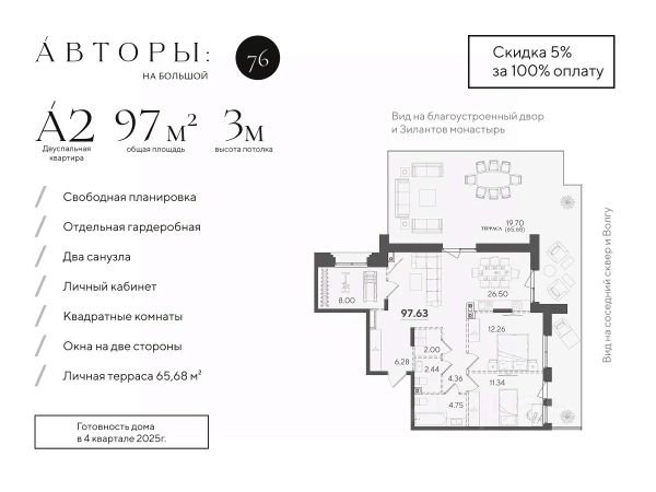 Вы можете приобрести эту квартиру в рассрочку с первоначальным взносом 30% и ежемесячным платежом 50 000 рублей. Подробнее - звоните! Продается 3-к квартира 11 в клубном доме "Авторы на Астрономической" в центре Казани, в шаге от канала Булак. Квартира на 3 этаже площадью 117,2 м², высотой потолков 3 м. Квартира сдается в свободной планировке, предоставляя полную свободу для ваших предпочтений в дизайне и возможность подстроить пространство под ваши жизненные ценности. Срок сдачи дома — 2-й квартал 2027 года. В клубном доме всего 25 квартир от 31м² до 117м². Возможно приобретение с полной оплатой (при полной оплате скидка 10%), в рассрочку с первым взносом 20%, 30% или 50% ( при приобретении в рассрочку с первым взносом 50% возможна скидка до 5% от стоимости), а также оформление ипотеки. Клубный дом "Авторы на Астрономической" в историческом центре Казани, в пешей доступности от Кремля и главных достопримечательностей города. Вы находитесь в самом центре: можно выйти из дома и быстро добраться в любую часть города, даже в час пик. В соответствии с современными стандартами бизнес-класса "Авторы" предлагают особые решения для вашего комфорта: • Тактильная натуральная архитектура из ригельного кирпича ручной формовки. • Закрытая территория с круглосуточным видеонаблюдением. • Трехсекционный двор с высокорослыми растениями и озеленением по философии Хаяо Миядзаки. • Подземный паркинг с умным въездом (распознавание госномеров). • Астро-лобби с круглосуточным консьержем, зонами отдыха и дизайнерской отделкой из натуральных коллекционных материалов для создания атмосферы высокого класса. Особенным пространством в доме станет арт-зал с проекцией 360, которая предоставляет жителям дома возможность быть свидетелями произведений диджитал-художников, а также организовывать просмотры фильмов в формате приватного кинотеатра не выходя из дома. Компания "Авторы" — девелопер на рынке высококлассной недвижимости Казани. Как самостоятельный застройщик компания работает с 2022 года. В портфеле компании один сданный проект, пять клубных домов на этапе строительства и еще три в разработке. Компания входит в ТОП-5 застройщиков ЕРЗ** РТ по потребительским качествам. Сейчас компания ведет строительство проектов на ул. Большая, ул. Петербургская, ул. Годовикова и ул. Астрономическая. Продается 3-комнатная квартира с большой кухней в Казани.