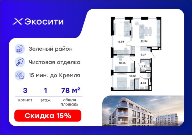 Продается 3-комн. квартира на 1-м этаже в строящемся проекте Экосити. Общая площадь лота составляет 66,68 кв. м, из которых 33,12 кв. м отведено под жилую и 18,62 кв. м под кухонную зону. Номер квартиры - 319 Преимущества квартиры в Урбан-квартале: • Квартира с полностью чистовой отделкой. В комнатах и коридоре: - натяжной потолок, - стены оклеены обоями под покраску, - полы: ламинат, плинтусы и напольная плитки - установлены межкомнатные двери и подоконники. В санузлах: - на стенах - керамогранитная плитка и/или окраска водостойкой краской - на полу - керамогранитная плитка; - натяжной потолок - сантехника: ванна и экран под ванну/душевой поддон, унитаз, раковины и смесители, монтаж водопровода и канализации - Предусмотрен расширенный пакет системы Умный Дом: бесключевой доступ в подъезд, видеодомофон с функцией Face ID, видеонаблюдение, автоматизированный сбор и передача показаний счётчиков; - На территории Урбан-квартала предусмотрено строительство детского сада на 360 мест, школы на 1501 место, детский развивающий центр на 2000 мест. - Рядом с с кварталом Резиденции запланировано строительство детского сада на 360 мест, школы с детским развивающим центром на 1501 место - На первых этажах домов Урбан-квартала запроектированы коммерческие помещения - предусмотрены места для супермаркетов, бытовых услуг, кафе. - Собственный комьюнити-центр для жителей Урбан-квартала - Клуб Резидентов для жителей квартала Резиденции - бульвар "Река между камней" с плейхабом для детей, амфитеатром, спортивными зонами, аллеей достижений. Всем посетителям будет доступен иммерсивный маршрут и AR-игры. - Тайная тропа вдоль которой расположатся зоны тихого отдыха, йоги и медитаций - 2 смотровые площадки - Снейк-ран - Круговой спортивный маршрут - Специальные зоны для выгула собак - В Урбан-квартале предусмотрено строительство 2 многоэтажных паркингов на 300 и 360 машиномест. Всем жителям проекта доступен и привычный плоскостной паркинг вокруг территории проекта с возможностью в приложении дома получить информацию о наличии парковочных мест. - В квартале Резиденции предусмотрен подземный паркинг на 260 машиномест Экосити — это совершенство города в первозданной природе. Наполненный возможностями квартал, в котором вы не выбираете между городом или природой, семьей или работой, отдыхом или спортом, — вы берете всё сразу. Каждая семья, каким бы составом она ни жила, найдет для себя идеальное пространство. Планировочные решения разнообразны, также как и возможности отделки от черновой до полностью с ремонтом. Здесь запроектированы квартиры с просторной кухней-гостиной, чтобы семья могла комфортно проводить время вместе. Квартиры сдаются с современной качественной отделкой, что позволяет после сдачи дома сразу начать жить, избежав долгих самостоятельных ремонтов. Цветовые решения и стиль отделки можно выбрать при покупке квартиры. Резиденции сдаются в черновой отделке, вы могли реализовать ваши самые смелые дизайнерские решения. Каждая резиденция это баз