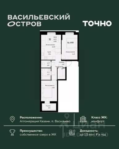 ЖК "Васильевский остров" — масштабный проект ТОЧНО в Казанской агломерации. Просторная территория 88 Га спроектирована для комфортной жизни: озеро с набережной и пляжем, каток, зелёные маршруты. В проекте комплекса — школа на 1 224 места, 2 детских сада на 680 мест, детская и взрослая поликлиники, фитнес-центр с бассейном, термальный комплекс, фермерский рынок, магазины, кафе и рестораны.