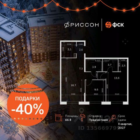 Прямая продажа от застройщика! Клубный дом бизнес-класса в самом сердце Казани, на улице Даурской. Продаётся 3-к квартира номер 398 общей площадью 68.6 кв.м. на 13-м этаже 14 этажного здания. Отделка Whitebox. Цена с учётом скидки. Особенности квартиры: - Мастер-зона с санузлом. Уют и комфорт в одном пространстве. - Угловая планировка - больше пространства для ваших идей. - Евроформат - просторное и удобное жилье с отличной планировкой. - Балкон - открытое пространство для отдыха. Квартира с предчистовой отделкой (White box). Вам не придется заниматься черновыми и трудоёмкими работы, а чистовую отделку и дизайн - сделайте на свой вкус. Информация о комплексе: "Фриссон" - клубный дом бизнес-класса в самом сердце Казани, на улице Даурской. Лейтмотивом проекта стала музыка - её сила, гармония и способность возвышать нас над повседневностью. Подобно нотам, рождающим бесконечное множество мелодий, квартиры в "Фриссоне" создают пространство для творчества, вдохновения и личного ритма жизни. Архитектура клубного дома словно симфония: переменная высота корпусов, выразительные фасады и динамика линий создают ощущение лёгкости и движения. Свет свободно проникает во внутренние дворы и квартиры, наполняя пространство теплом и гармонией. Здесь каждый день звучит по-своему - в унисон с вашим настроением. Транспортная доступность: - 5 мин. на машине до Метро Аметьево - 8 мин. на машине до ТЦ "KazanMall" - 3 мин. пешком до школы - 1 мин. пешком до Детского сада "Фриссон" - 3 мин. до поликлиники Внутренняя инфраструктура: Гармония уюта, ритма и комфорта. Для маленьких жителей комплекса предусмотрены детские площадки с элементами музыкальной тематики, где можно играть, исследовать мир звуков и развивать творческое мышление. На территории "Фриссона" разместится двухэтажный детский сад на 80 мест - современное и безопасное пространство, где дети всегда рядом с родителями. Закрытая территория, концепция "двор без машин" и круглосуточное видеонаблюдение обеспечивают спокойствие и безопасность жителей. В каждом подъезде предусмотрены колясочные, а во дворе - велопарковки, чтобы коляски, велосипеды и самокаты всегда были под рукой. На первых этажах корпусов расположатся кафе и магазины, делающие жизнь максимально удобной. Здесь всё продумано для того, чтобы дом стал местом вдохновения, а двор - пространством, наполненным радостью и энергией жизни.