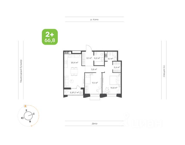 Квартира на 2 стороны света Увеличенная кухня-гостиная с выходом на лоджию Уютная эргономичная детская Светлая спальня правильной формы с 2 окнами и местом под шкаф Вместительная ванная комната и дополнительный санузел для комфорта всей семьи Жилые комнаты расположены в тихой приватной части квартиры Высота потолка 2,7 м Улучшенная предчистовая отделка