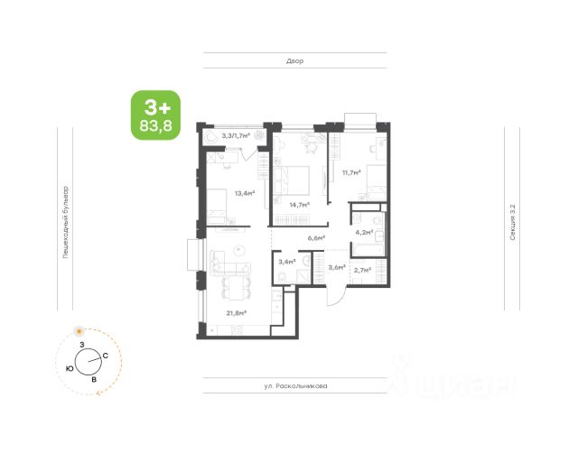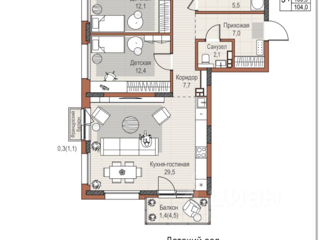 Светлая кухня-гостиная увеличенной площади с двумя окнами Просторная спальня с возможностью зонирования Функциональные детские комнаты правильной оформы Два санузла для комфорта всей семьи Удобнаяприхожая с нишей под шкаф и гардеробную Высота потолков2,7м Улучшенная предчистовая отделка