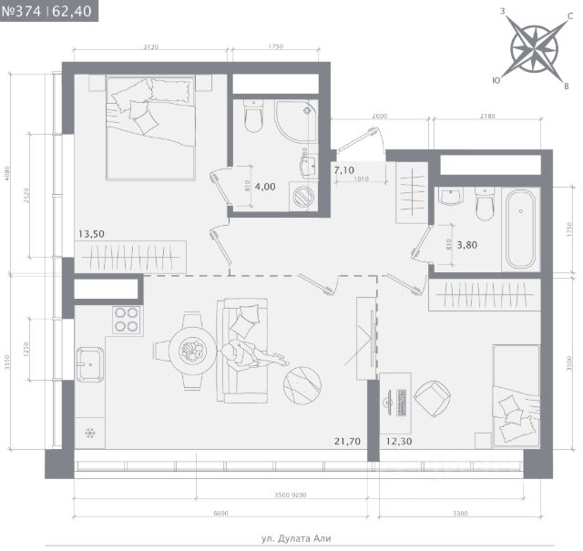Продаётся 2-комнатная квартира в строящемся доме (Дом 1), срок сдачи: IV-кв. 2027, общей площадью 60.4 кв.м., на 4 этаже.