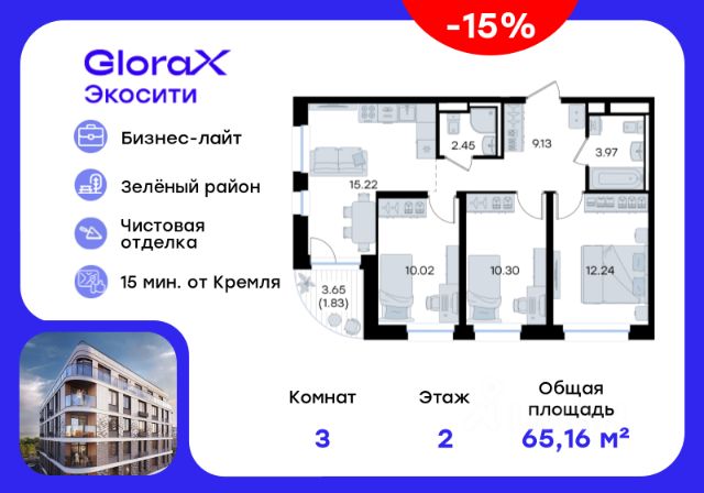 Продается 3-комн. квартира на 2-м этаже в строящемся проекте GloraX Экосити. Общая площадь лота составляет 63,22 кв. м, из которых 30,43 кв. м отведено под жилую и 15,87 кв. м под кухонную зону. Номер квартиры - 410 Преимущества квартиры: • Квартира с полностью чистовой отделкой. В комнатах и коридоре: - натяжной потолок, - стены оклеены обоями под покраску, - полы: ламинат, плинтусы и напольная плитки - установлены межкомнатные двери и подоконники. В санузлах: - на стенах - керамогранитная плитка и/или окраска водостойкой краской - на полу - керамогранитная плитка; - натяжной потолок - сантехника: ванна и экран под ванну/душевой поддон, унитаз, раковины и смесители, монтаж водопровода и канализации - Предусмотрен расширенный пакет системы Умный Дом: бесключевой доступ в подъезд, видеодомофон с функцией Face ID, видеонаблюдение, автоматизированный сбор и передача показаний счётчиков; - Внутренние дворы каждого урбан-блока закрытые, благоустройство по индивидуальному проекту. - На территории квартала предусмотрено строительство детского сада на 360 мест, школы на 1501 место, ДОУ на 2000 мест. - На первых этажах домов запроектированы коммерческие помещения - предусмотрены места для супермаркетов, бытовых услуг, кафе. - Собственный комьюнити-центр для жителей жилого комплекса - бульвар "Река между камней" с плейхабом для детей, амфитеатром, спортивными зонами, аллеей достижений. Всем посетителям будет доступен иммерсивный маршрут и AR-игры. - лесная прогулочная аллея вдоль которой расположатся зоны тихого отдыха, йоги и медитаций - 2 смотровые площадки - специальная зона для выгула собак - В жилом комплексе предусмотрено строительство 2 многоэтажных паркингов на 300 и 360 машиномест. Всем жителям проекта доступен и привычный плоскостной паркинг вокруг территории проекта с возможностью в приложении дома получить информацию о наличии парковочных мест. GloraX Экосити — это совершенство города в первозданной природе. Наполненный возможностями район, в котором вы не выбираете между городом или природой, семьей или работой, отдыхом или спортом, — вы берете всё сразу. Каждая семья, каким бы составом она ни жила, найдет для себя идеальное пространство. Планировочные решения запроектированы с просторной кухней-гостиной, чтобы семья могла комфортно проводить время вместе. В целях безопасности в детских комнатах отсутствуют балконы и лоджии. Квартиры сдаются с современной качественной отделкой, что позволяет после сдачи дома сразу начать жить, избежав долгих самостоятельных ремонтов. Цветовые решения и стиль отделки можно выбрать при покупке квартиры. Цена указана при 100% оплате или стандартной ипотеке. Узнайте подробности в Отделе продаж.