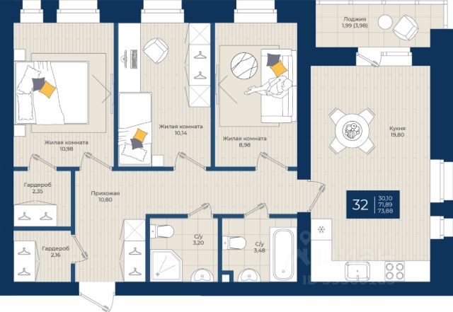 Продаётся 3-комнатная квартира в строящемся доме (дом 1), срок сдачи: III-кв. 2026, общей площадью 73.88 кв.м., на 2 этаже.