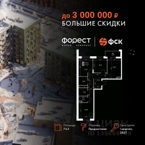 Прямая продажа от застройщика! Корпус 1.1 сдан! Жилой Комплекс комфорт-класса. Продаётся 3-к квартира номер 70 общей площадью 74.3 кв.м. на 2-м этаже 6 этажного здания. Отделка Whitebox. Цена с учётом скидки. Особенности квартиры: Квартира с предчистовой отделкой (White box). Вам не придется заниматься черновыми и трудоёмкими работы, а чистовую отделку и дизайн - сделайте на свой вкус. Информация о комплексе: "Форест" - жилой комплекс комфорт-класса, созданный для тех, кто ищет гармонию с природой, не отказываясь от городского ритма. Расположенный в окружении леса и реки, он воплощает мечту о загородной жизни со всеми удобствами города. Здесь можно проживать самые тёплые моменты с близкими, дышать свежим хвойным воздухом, встречать утро на собственной террасе или проводить вечера с друзьями под открытым небом. Благоустроенная территория, прогулочные дорожки и зоны отдыха создают атмосферу уюта и гармонии. Поблизости - лес и Волга, куда можно выбраться на прогулку в любое время, не дожидаясь выходных. Благодаря вечнозелёным растениям и продуманному озеленению, дворы остаются зелёными круглый год. Транспортная доступность: - 4 мин. пушком до автобусной остановки - 5 мин. на машине до школы Внутренняя инфраструктура: Продуманное пространство для жизни, отдыха и развития. На территории комплекса работает собственный детский сад - современное и безопасное пространство, где дети всегда рядом с родителями. Во дворе установлены игровые комплексы для активных прогулок и развития малышей на свежем воздухе. Жителям доступны кафе и магазины, площадки для прогулок с питомцами, зоны для пикников и барбекю. Для любителей активного образа жизни предусмотрены велодорожки, воркаут-зоны и тропы для хайкинга, а в шаговой доступности находятся планетарий и глэмпинг. Просторный двор без машин и закрытая территория с системой контроля доступа обеспечивают высокий уровень безопасности и приватности. Здесь можно по-настоящему расслабиться и чувствовать себя дома - в окружении природы, комфорта и заботы о каждом дне.