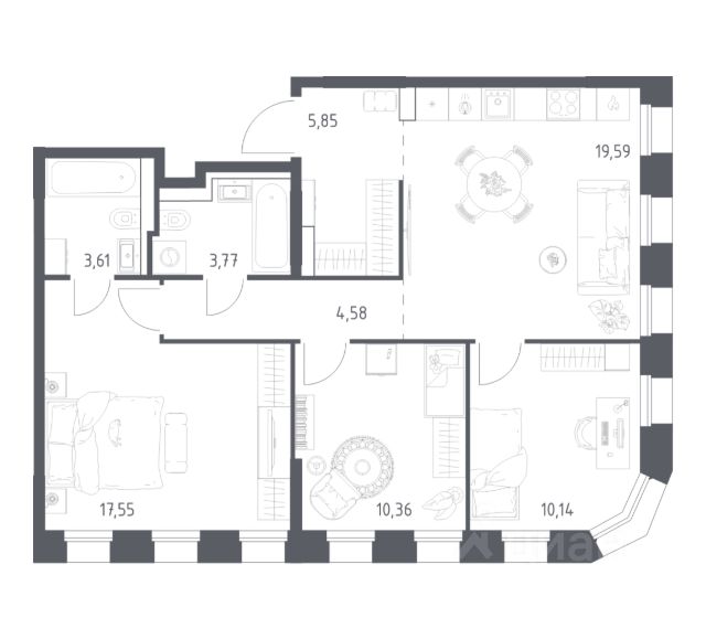 Жилой дом предлагает большое разнообразие планировок: студии, 1-комнатные, 2-комнатные (в том числе с европланировкой), просторные 3-комнатные. Квартиры с мастер-спальнями, гардеробными, видовые, с панорамными и угловыми окнами. Увеличенные оконные проёмы для создания светлого пространства.