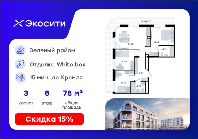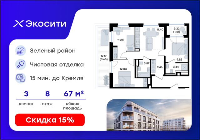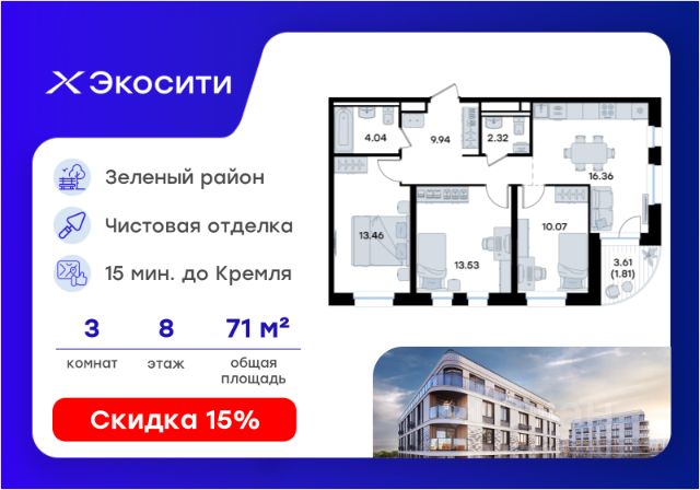 Продается 3-комн. квартира на 8-м этаже в строящемся проекте Экосити. Общая площадь лота составляет 71,53 кв. м, из которых 37,06 кв. м отведено под жилую и 16,36 кв. м под кухонную зону. Номер квартиры - 401 Преимущества квартиры в Урбан-квартале: • Квартира с полностью чистовой отделкой. В комнатах и коридоре: - натяжной потолок, - стены оклеены обоями под покраску, - полы: ламинат, плинтусы и напольная плитки - установлены межкомнатные двери и подоконники. В санузлах: - на стенах - керамогранитная плитка и/или окраска водостойкой краской - на полу - керамогранитная плитка; - натяжной потолок - сантехника: ванна и экран под ванну/душевой поддон, унитаз, раковины и смесители, монтаж водопровода и канализации - Предусмотрен расширенный пакет системы Умный Дом: бесключевой доступ в подъезд, видеодомофон с функцией Face ID, видеонаблюдение, автоматизированный сбор и передача показаний счётчиков; - На территории Урбан-квартала предусмотрено строительство детского сада на 360 мест, школы на 1501 место, детский развивающий центр на 2000 мест. - Рядом с с кварталом Резиденции запланировано строительство детского сада на 360 мест, школы с детским развивающим центром на 1501 место - На первых этажах домов Урбан-квартала запроектированы коммерческие помещения - предусмотрены места для супермаркетов, бытовых услуг, кафе. - Собственный комьюнити-центр для жителей Урбан-квартала - Клуб Резидентов для жителей квартала Резиденции - бульвар "Река между камней" с плейхабом для детей, амфитеатром, спортивными зонами, аллеей достижений. Всем посетителям будет доступен иммерсивный маршрут и AR-игры. - Тайная тропа вдоль которой расположатся зоны тихого отдыха, йоги и медитаций - 2 смотровые площадки - Снейк-ран - Круговой спортивный маршрут - Специальные зоны для выгула собак - В Урбан-квартале предусмотрено строительство 2 многоэтажных паркингов на 300 и 360 машиномест. Всем жителям проекта доступен и привычный плоскостной паркинг вокруг территории проекта с возможностью в приложении дома получить информацию о наличии парковочных мест. - В квартале Резиденции предусмотрен подземный паркинг на 260 машиномест Экосити — это совершенство города в первозданной природе. Наполненный возможностями квартал, в котором вы не выбираете между городом или природой, семьей или работой, отдыхом или спортом, — вы берете всё сразу. Каждая семья, каким бы составом она ни жила, найдет для себя идеальное пространство. Планировочные решения разнообразны, также как и возможности отделки от черновой до полностью с ремонтом. Здесь запроектированы квартиры с просторной кухней-гостиной, чтобы семья могла комфортно проводить время вместе. Квартиры сдаются с современной качественной отделкой, что позволяет после сдачи дома сразу начать жить, избежав долгих самостоятельных ремонтов. Цветовые решения и стиль отделки можно выбрать при покупке квартиры. Резиденции сдаются в черновой отделке, вы могли реализовать ваши самые смелые дизайнерские решения. Каждая резиденция это баз