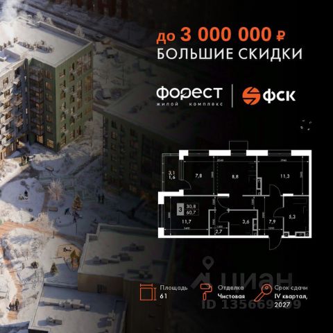 Прямая продажа от застройщика! Корпус 1.1 сдан! Жилой Комплекс комфорт-класса. Продаётся 3-к квартира номер 70 общей площадью 74.3 кв.м. на 2-м этаже 6 этажного здания. Отделка Whitebox. Цена с учётом скидки. Особенности квартиры: Квартира с предчистовой отделкой (White box). Вам не придется заниматься черновыми и трудоёмкими работы, а чистовую отделку и дизайн - сделайте на свой вкус. Информация о комплексе: "Форест" - жилой комплекс комфорт-класса, созданный для тех, кто ищет гармонию с природой, не отказываясь от городского ритма. Расположенный в окружении леса и реки, он воплощает мечту о загородной жизни со всеми удобствами города. Здесь можно проживать самые тёплые моменты с близкими, дышать свежим хвойным воздухом, встречать утро на собственной террасе или проводить вечера с друзьями под открытым небом. Благоустроенная территория, прогулочные дорожки и зоны отдыха создают атмосферу уюта и гармонии. Поблизости - лес и Волга, куда можно выбраться на прогулку в любое время, не дожидаясь выходных. Благодаря вечнозелёным растениям и продуманному озеленению, дворы остаются зелёными круглый год. Транспортная доступность: - 4 мин. пушком до автобусной остановки - 5 мин. на машине до школы Внутренняя инфраструктура: Продуманное пространство для жизни, отдыха и развития. На территории комплекса работает собственный детский сад - современное и безопасное пространство, где дети всегда рядом с родителями. Во дворе установлены игровые комплексы для активных прогулок и развития малышей на свежем воздухе. Жителям доступны кафе и магазины, площадки для прогулок с питомцами, зоны для пикников и барбекю. Для любителей активного образа жизни предусмотрены велодорожки, воркаут-зоны и тропы для хайкинга, а в шаговой доступности находятся планетарий и глэмпинг. Просторный двор без машин и закрытая территория с системой контроля доступа обеспечивают высокий уровень безопасности и приватности. Здесь можно по-настоящему расслабиться и чувствовать себя дома - в окружении природы, комфорта и заботы о каждом дне.