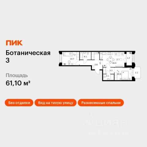 • ✓ В базе Циан 1 3-комнатных квартир в кирпично-монолитном доме на улице Дулата Али в городе Казань