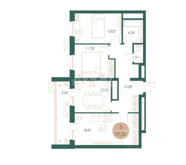 Продаётся 3-комнатная квартира в строящемся доме (Корпус 1), срок сдачи: II-кв. 2028, общей площадью 75.6 кв.м., на 16 этаже.