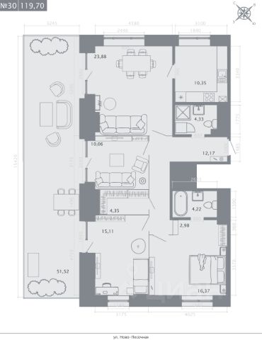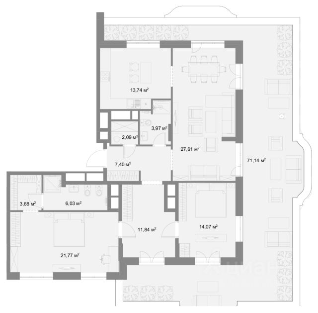 Ключевое преимущество квартиры терраса площадью 12,2 кв.м., на которой возможно вы будете проводить бОльшую часть времени)