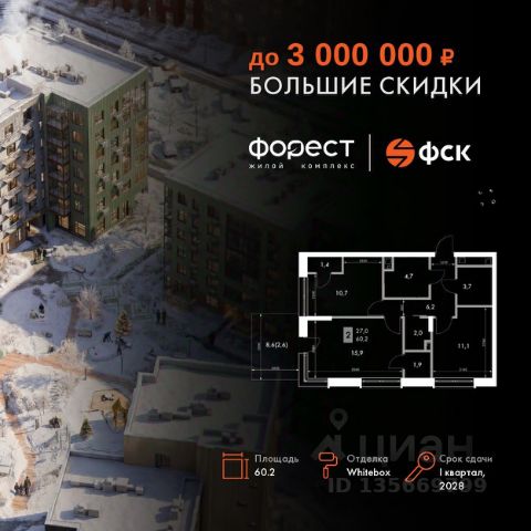 Прямая продажа от застройщика! Корпус 1.1 сдан! Жилой Комплекс комфорт-класса. Продаётся 3-к квартира номер 31 общей площадью 69.3 кв.м. на 6-м этаже 6 этажного здания. Отделка Whitebox. Цена с учётом скидки. Особенности квартиры: - Мастер-зона с санузлом. Уют и комфорт в одном пространстве. - Угловая планировка - больше пространства для ваших идей. - Евроформат - просторное и удобное жилье с отличной планировкой. - Балкон - открытое пространство для отдыха. - Большой балкон - больше пространства для вашего отдыха. Квартира с предчистовой отделкой (White box). Вам не придется заниматься черновыми и трудоёмкими работы, а чистовую отделку и дизайн - сделайте на свой вкус. Информация о комплексе: "Форест" - жилой комплекс комфорт-класса, созданный для тех, кто ищет гармонию с природой, не отказываясь от городского ритма. Расположенный в окружении леса и реки, он воплощает мечту о загородной жизни со всеми удобствами города. Здесь можно проживать самые тёплые моменты с близкими, дышать свежим хвойным воздухом, встречать утро на собственной террасе или проводить вечера с друзьями под открытым небом. Благоустроенная территория, прогулочные дорожки и зоны отдыха создают атмосферу уюта и гармонии. Поблизости - лес и Волга, куда можно выбраться на прогулку в любое время, не дожидаясь выходных. Благодаря вечнозелёным растениям и продуманному озеленению, дворы остаются зелёными круглый год. Транспортная доступность: - 4 мин. пушком до автобусной остановки - 5 мин. на машине до школы Внутренняя инфраструктура: Продуманное пространство для жизни, отдыха и развития. На территории комплекса работает собственный детский сад - современное и безопасное пространство, где дети всегда рядом с родителями. Во дворе установлены игровые комплексы для активных прогулок и развития малышей на свежем воздухе. Жителям доступны кафе и магазины, площадки для прогулок с питомцами, зоны для пикников и барбекю. Для любителей активного образа жизни предусмотрены велодорожки, воркаут-зоны и тропы для хайкинга, а в шаговой доступности находятся планетарий и глэмпинг. Просторный двор без машин и закрытая территория с системой контроля доступа обеспечивают высокий уровень безопасности и приватности. Здесь можно по-настоящему расслабиться и чувствовать себя дома - в окружении природы, комфорта и заботы о каждом дне.