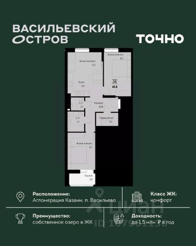ЖК "Васильевский остров" — масштабный проект ТОЧНО в Казанской агломерации. Просторная территория 88 Га спроектирована для комфортной жизни: озеро с набережной и пляжем, каток, зелёные маршруты. В проекте комплекса — школа на 1 224 места, 2 детских сада на 680 мест, детская и взрослая поликлиники, фитнес-центр с бассейном, термальный комплекс, фермерский рынок, магазины, кафе и рестораны.