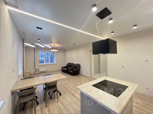 Просторная кухня-гостиная, балкон утеплен, вынесен в жилую зону (без выноса обогревателей), сделана барная зона с большими окнами, из которых открывается потрясающий вид на город, там же расположился уютный диван для отдыха или работы.