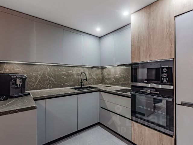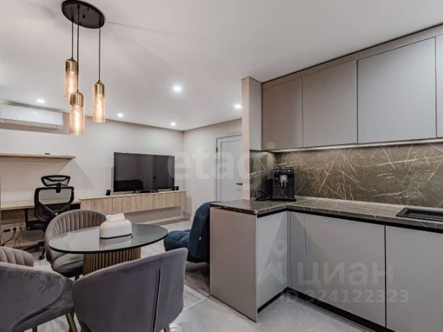 Квартира сочетает в себе концептуальный стиль и минимализм. Мебель по индивидуальному заказу вписана в интерьер таким образом, что её не заметно, при высокой функциональности. Это создаёт простор в каждом помещении. Стильный кухонный гарнитур, стеклянные шкафы с алюминиевым профилем. Квартира укомплектована мебелью, предметами интерьера, текстиля, декором, кухонный гарнитур с вместительной посудомоечной машиной, встроенной техникой.