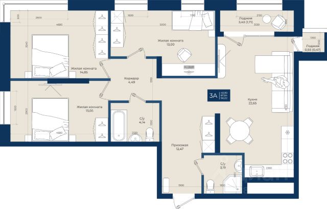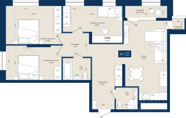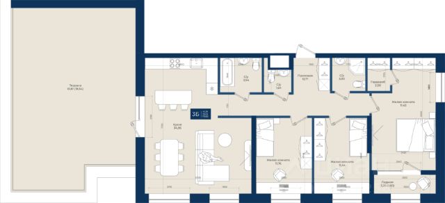площадь квартиры 84,6 кв.м. с большим количеством света и функциональной планировкой, включающая в себя просторный коридор, 3 отдельные изолированные комнаты (17,29 кв.м., 13,55 кв.м., 13,31 кв.м.), 2 санузла, один из которых совмещен и уютную, светлую кухню-гостиную с выходом на собственную террасу площадью 75 кв.м!!!, которая будет местом притяжения и атмосферных встреч для большой и дружной семьи. Следует отметить, что площадь террасы не включена в площадь квартиры, и являясь огромных преимуществом, не требует оплаты