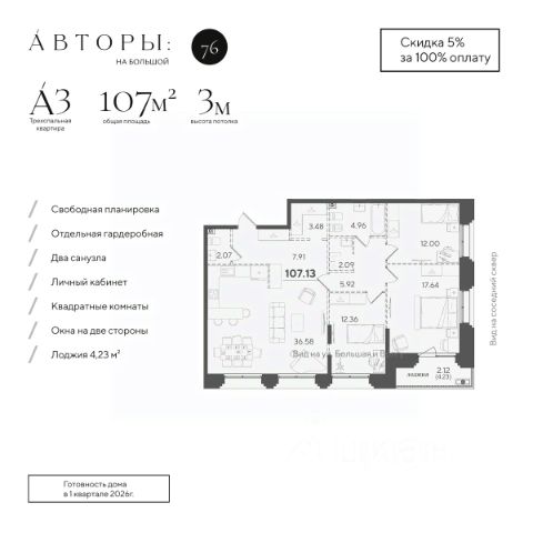 Продается 3-к квартира 5 в клубном доме "Авторы на Большой 62". Квартира с тремя спальнями на 2 этаже площадью 90.63 м², кухней-гостинной площадью 27.09 м², высотой потолков 3 м и двумя санузлами. Окна выходят на две стороны и открывают вид на дзен-двор с обильным озеленением и ул. Урицкого. Квартира сдается в свободной планировке, предоставляя полную свободу для ваших предпочтений в дизайне и возможность подстроить пространство под ваши жизненные ценности. Срок сдачи дома — 1-й квартал 2026 года. В клубном доме всего 27 квартир, включая 2 эксклюзивных пентхауса. Проект "Авторы на Большой" входит в ТОП-3 малоквартирных домов в Казани, а также входит в ТОП-3 ЖК по результатам конкурса форума "Казаныш". Квартиры в домах бизнес-класса "Авторы на Большой" расположены всего в 7-ми минутах от исторического центра Казани и в 2-х минутах от новой соборной мечети, начало строительства которой запланировано на 2025 год. Исключительное местоположение проекта позволяет насладиться видом на Волгу, а концепция клубного дома создаёт атмосферу уединения и спокойствия в самом сердце города. В соответствии с современными стандартами бизнес-класса "Авторы" предлагают особые рещения для вашего комфорта: • Закрытая территория с круглосуточным видеонаблюдением. • Подземный паркинг с электрозаправками, келлеры для хранения, умный въезд с распознаванием номеров. • Натуральные коллекционные материалы в лобби для создания атмосферы премиум-класса. Дзен-двор разработан в концепции "городской гостиной", оснащенной барной сткойкой для уютных встреч и коворкингом для комфортной работы на открытом воздухе. Детская зона вдохновлена тематикой реки и её естественной средой. Площадь двора составляет 1100 м², на которых расположатся более 15 видов декоративных растений и цветников. Компания "Авторы" — девелопер на рынке высококлассной недвижимости Казани. Как самостоятельный застройщик компания работает с 2022 года, а в начале 2024 года успешно сдали свой первый проект ЖК "Дом у озера", где 96% квартир были приняты дольщиками с первого раза и без критичных замечаний. Компания входит в ТОП-5 застройщиков РТ по потребительским качествам ЕРЗ. Сейчас компания ведет строительство проектов на ул. Большая, ул. Петербургская, ул. Годовикова и ул. Астрономическая Подробнее - звоните! Купить 3-комнатную квартиру в микрорайоне Адмиралтейская слобода в городе Казань.