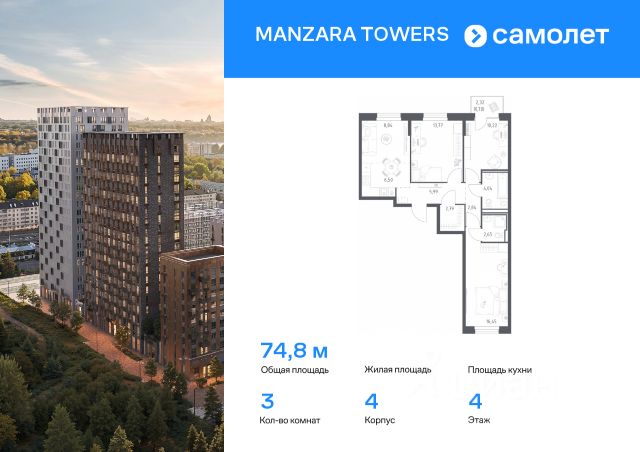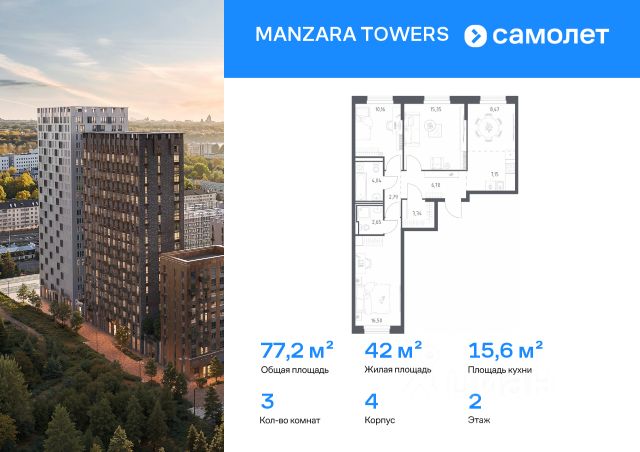 Строим кварталы для жизни с заботой о будущем. Предлагается 3-комнатная квартира комфорт-класса 71,05 кв.м в корпусе 5 на 4 этаже, в MANZARA TOWERS Квартира с черновой отделкой. Доступность опции "отделка" и возможность комплектации мебелью и декором уточняйте у застройщика. Приобрести квартиру возможно по специальным акциям от застройщика, с текущими условиями акций можно ознакомиться в блоке "Акций". Цена динамическая и может отличаться, уточняйте актуальность у застройщика. Manzara Towers — это дома высотой от 7 до 24 этажей. В увеличенных окнах с зеркальной поверхностью отражаются облака и солнечные блики. Тихий двор с игровыми площадками и воркаут-пространством идеален для прогулок с кофе. На первом этаже есть выход на стилобат, где появятся зеленые оазисы и открытые террасы. Дома соединяет между собой частично прозрачный пешеходный мост. Предусмотрены подземный и 6-этажный многоуровневый паркинги. До ж/д вокзалов можно доехать за 20 минут. Или в обеденный перерыв встретиться с друзьями в центре города — дорога на машине займет около 15 минут. На первых этажах корпусов откроется детская поликлиника, ФОК с бассейном, магазины, кафе и салоны красоты. Для маленьких жителей уже работают 3 детских сада и лицей, до которых можно дойти за 615 минут. Во всех наших корпусах входы в светлые лобби находятся на уровне земли. На первом этаже есть специальные места для хранения колясок и велосипедов.