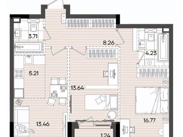 ~ Кабинет/детская (10 м²): Изолированная комната с окнами на балкон. Всегда теплая, идеально подходит для ребенка или домашнего офиса.