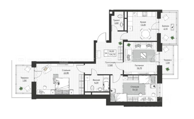 -Просторные жилые комнаты 24,9+20,4+19,3 кв м