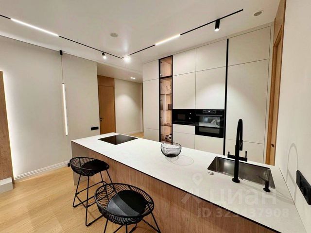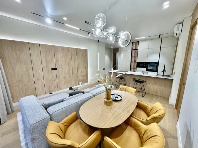 Квартира сочетает в себе концептуальный стиль и минимализм. Мебель по индивидуальному заказу вписана в интерьер таким образом, что её не заметно, при высокой функциональности. Это создаёт простор в каждом помещении. Стильный кухонный гарнитур, стеклянные шкафы с алюминиевым профилем. Квартира укомплектована мебелью, предметами интерьера, текстиля, декором, кухонный гарнитур с вместительной посудомоечной машиной, встроенной техникой.