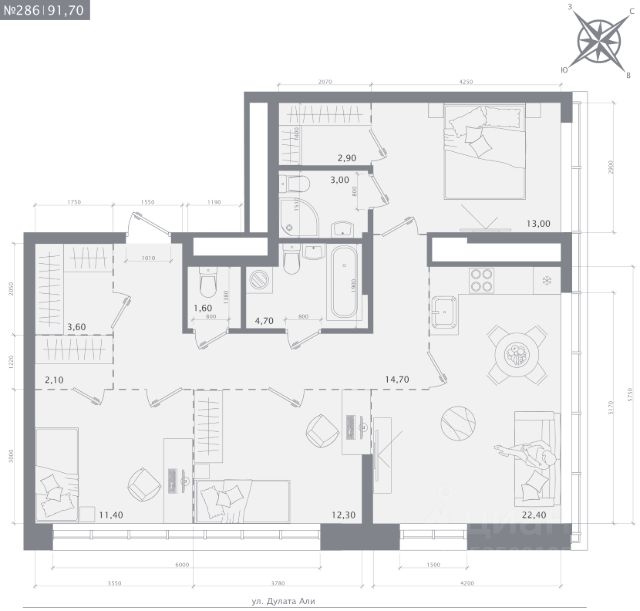 Продаётся 3-комнатная квартира в строящемся доме (Дом 2), срок сдачи: IV-кв. 2027, общей площадью 91.7 кв.м., на 12 этаже.