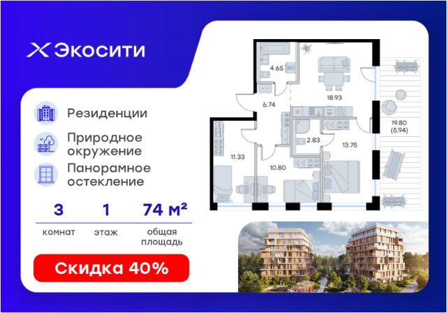 Продается 3-комн. квартира на 1-м этаже в строящемся проекте Экосити. Общая площадь лота составляет 74,63 кв. м, из которых 35,93 кв. м отведено под жилую и 15,27 кв. м под кухонную зону. Номер квартиры - 209 Преимущества резиденции в квартале "Резиденции": - перегородки межкомнатные перегородки в 1 кирпич, в С/У в 2 кирпича с заведением гидроизоляции на 20 см - потолки - без отделки - полы в помещениях: жилые комнаты, гардеробная, коридор, прихожая, кухня - шумоизоляция пола, стяжка -полы во влажных помещениях - гидроизоляция, стяжка -водоснабжение -ввод ХВС, ГВС, канализации в ближайший СУ/в квартиру - электрический щит - временный, при входе в квартиру - отопление - горизонтальная разводка в полу с установкой - входная дверь - металлическая входная дверь с декоративной накладкой - На территории Урбан-квартала предусмотрено строительство детского сада на 360 мест, школы на 1501 место, детский развивающий центр на 2000 мест. - Рядом с с кварталом Резиденции запланировано строительство детского сада на 360 мест, школы с детским развивающим центром на 1501 место - На первых этажах домов Урбан-квартала запроектированы коммерческие помещения - предусмотрены места для супермаркетов, бытовых услуг, кафе. - Собственный комьюнити-центр для жителей Урбан-квартала - Клуб Резидентов для жителей квартала Резиденции - бульвар "Река между камней" с плейхабом для детей, амфитеатром, спортивными зонами, аллеей достижений. Всем посетителям будет доступен иммерсивный маршрут и AR-игры. - Тайная тропа вдоль которой расположатся зоны тихого отдыха, йоги и медитаций - 2 смотровые площадки - Снейк-ран - Круговой спортивный маршрут - Специальные зоны для выгула собак - В Урбан-квартале предусмотрено строительство 2 многоэтажных паркингов на 300 и 360 машиномест. Всем жителям проекта доступен и привычный плоскостной паркинг вокруг территории проекта с возможностью в приложении дома получить информацию о наличии парковочных мест. - В квартале Резиденции предусмотрен подземный паркинг на 260 машиномест Экосити — это совершенство города в первозданной природе. Наполненный возможностями квартал, в котором вы не выбираете между городом или природой, семьей или работой, отдыхом или спортом, — вы берете всё сразу. Каждая семья, каким бы составом она ни жила, найдет для себя идеальное пространство. Планировочные решения разнообразны, также как и возможности отделки от черновой до полностью с ремонтом. Здесь запроектированы квартиры с просторной кухней-гостиной, чтобы семья могла комфортно проводить время вместе. Резиденции сдаются в черновой отделке, вы могли реализовать ваши самые смелые дизайнерские решения. Каждая резиденция это база, на которой можно выстроить свой личный стиль. Цена указана при 100% оплате или стандартной ипотеке. Узнайте подробности в Отделе продаж.