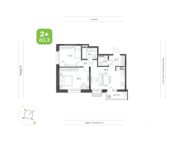 Квартира на 2 стороны света Окна выходят в тихий двор Просторная кухня-гостиная с выходом на балкон Простораня спальня с местом под шкаф и рабочую / будуарную зону Продуманная детская правильной формы Раздельный санузел Высота потолка 2,7 м Улучшенная предчистовая отделка