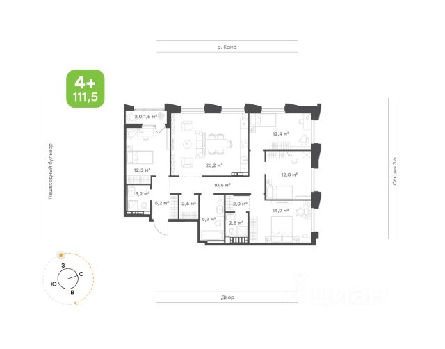 Просторная квартира на 2 стороны света Ванная комната и дополнительный санузел для комфорта семьи Вместительная гардеробная в коридоре Кухня оптимальной площади Функциональная спальня и детская правильной формы Высота потолка 2,73 м Улучшенная предчистовая отделка