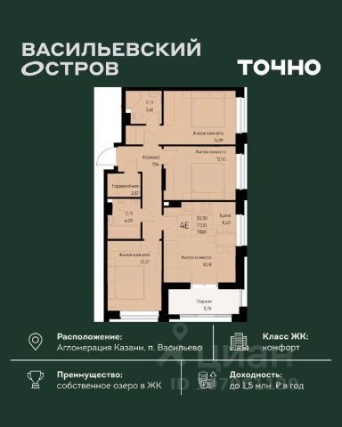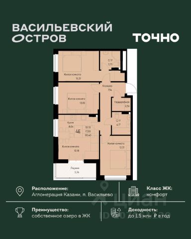 ЖК "Васильевский остров" — масштабный проект ТОЧНО в Казанской агломерации. Просторная территория 88 Га спроектирована для комфортной жизни: озеро с набережной и пляжем, каток, зелёные маршруты. В проекте комплекса — школа на 1 224 места, 2 детских сада на 680 мест, детская и взрослая поликлиники, фитнес-центр с бассейном, термальный комплекс, фермерский рынок, магазины, кафе и рестораны.