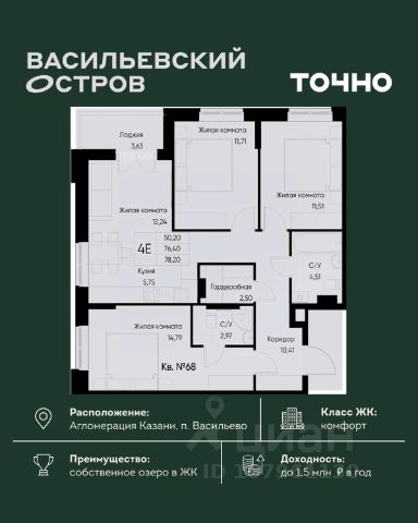 ЖК "Васильевский остров" — масштабный проект ТОЧНО в Казанской агломерации. Просторная территория 88 Га спроектирована для комфортной жизни: озеро с набережной и пляжем, каток, зелёные маршруты. В проекте комплекса — школа на 1 224 места, 2 детских сада на 680 мест, детская и взрослая поликлиники, фитнес-центр с бассейном, термальный комплекс, фермерский рынок, магазины, кафе и рестораны.
