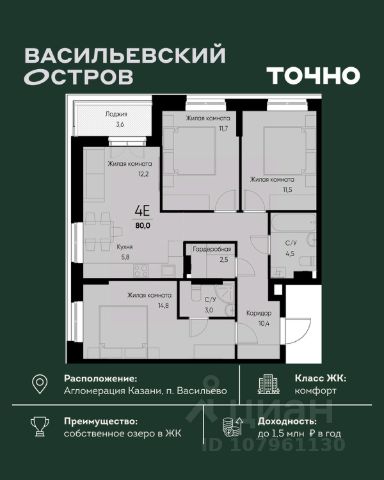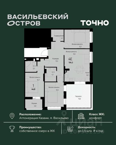Продается 4-комн. квартира на 9-м этаже в строящемся проекте Экосити. Общая площадь лота составляет 92,16 кв. м, из которых 42,10 кв. м отведено под жилую и 20,37 кв. м под кухонную зону. Номер квартиры - 406 Преимущества квартиры в Урбан-квартале: • Квартира с полностью чистовой отделкой. В комнатах и коридоре: - натяжной потолок, - стены оклеены обоями под покраску, - полы: ламинат, плинтусы и напольная плитки - установлены межкомнатные двери и подоконники. В санузлах: - на стенах - керамогранитная плитка и/или окраска водостойкой краской - на полу - керамогранитная плитка; - натяжной потолок - сантехника: ванна и экран под ванну/душевой поддон, унитаз, раковины и смесители, монтаж водопровода и канализации - Предусмотрен расширенный пакет системы Умный Дом: бесключевой доступ в подъезд, видеодомофон с функцией Face ID, видеонаблюдение, автоматизированный сбор и передача показаний счётчиков; - На территории Урбан-квартала предусмотрено строительство детского сада на 360 мест, школы на 1501 место, детский развивающий центр на 2000 мест. - Рядом с с кварталом Резиденции запланировано строительство детского сада на 360 мест, школы с детским развивающим центром на 1501 место - На первых этажах домов Урбан-квартала запроектированы коммерческие помещения - предусмотрены места для супермаркетов, бытовых услуг, кафе. - Собственный комьюнити-центр для жителей Урбан-квартала - Клуб Резидентов для жителей квартала Резиденции - бульвар "Река между камней" с плейхабом для детей, амфитеатром, спортивными зонами, аллеей достижений. Всем посетителям будет доступен иммерсивный маршрут и AR-игры. - Тайная тропа вдоль которой расположатся зоны тихого отдыха, йоги и медитаций - 2 смотровые площадки - Снейк-ран - Круговой спортивный маршрут - Специальные зоны для выгула собак - В Урбан-квартале предусмотрено строительство 2 многоэтажных паркингов на 300 и 360 машиномест. Всем жителям проекта доступен и привычный плоскостной паркинг вокруг территории проекта с возможностью в приложении дома получить информацию о наличии парковочных мест. - В квартале Резиденции предусмотрен подземный паркинг на 260 машиномест Экосити — это совершенство города в первозданной природе. Наполненный возможностями квартал, в котором вы не выбираете между городом или природой, семьей или работой, отдыхом или спортом, — вы берете всё сразу. Каждая семья, каким бы составом она ни жила, найдет для себя идеальное пространство. Планировочные решения разнообразны, также как и возможности отделки от черновой до полностью с ремонтом. Здесь запроектированы квартиры с просторной кухней-гостиной, чтобы семья могла комфортно проводить время вместе. Квартиры сдаются с современной качественной отделкой, что позволяет после сдачи дома сразу начать жить, избежав долгих самостоятельных ремонтов. Цветовые решения и стиль отделки можно выбрать при покупке квартиры. Резиденции сдаются в черновой отделке, вы могли реализовать ваши самые смелые дизайнерские решения. Каждая резиденция это баз