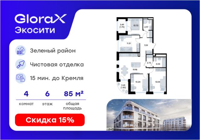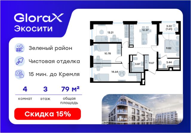 Продается 4-комн. квартира на 3-м этаже в строящемся проекте GloraX Экосити. Общая площадь лота составляет 86,09 кв. м, из которых 44,80 кв. м отведено под жилую и 20,53 кв. м под кухонную зону. Номер квартиры - 367 Преимущества квартиры: • Квартира с полностью чистовой отделкой. В комнатах и коридоре: - натяжной потолок, - стены оклеены обоями под покраску, - полы: ламинат, плинтусы и напольная плитки - установлены межкомнатные двери и подоконники. В санузлах: - на стенах - керамогранитная плитка и/или окраска водостойкой краской - на полу - керамогранитная плитка; - натяжной потолок - сантехника: ванна и экран под ванну/душевой поддон, унитаз, раковины и смесители, монтаж водопровода и канализации - Предусмотрен расширенный пакет системы Умный Дом: бесключевой доступ в подъезд, видеодомофон с функцией Face ID, видеонаблюдение, автоматизированный сбор и передача показаний счётчиков; - Внутренние дворы каждого урбан-блока закрытые, благоустройство по индивидуальному проекту. - На территории квартала предусмотрено строительство детского сада на 360 мест, школы на 1501 место, ДОУ на 2000 мест. - На первых этажах домов запроектированы коммерческие помещения - предусмотрены места для супермаркетов, бытовых услуг, кафе. - Собственный комьюнити-центр для жителей жилого комплекса - бульвар "Река между камней" с плейхабом для детей, амфитеатром, спортивными зонами, аллеей достижений. Всем посетителям будет доступен иммерсивный маршрут и AR-игры. - лесная прогулочная аллея вдоль которой расположатся зоны тихого отдыха, йоги и медитаций - 2 смотровые площадки - специальная зона для выгула собак - В жилом комплексе предусмотрено строительство 2 многоэтажных паркингов на 300 и 360 машиномест. Всем жителям проекта доступен и привычный плоскостной паркинг вокруг территории проекта с возможностью в приложении дома получить информацию о наличии парковочных мест. GloraX Экосити — это совершенство города в первозданной природе. Наполненный возможностями район, в котором вы не выбираете между городом или природой, семьей или работой, отдыхом или спортом, — вы берете всё сразу. Каждая семья, каким бы составом она ни жила, найдет для себя идеальное пространство. Планировочные решения запроектированы с просторной кухней-гостиной, чтобы семья могла комфортно проводить время вместе. В целях безопасности в детских комнатах отсутствуют балконы и лоджии. Квартиры сдаются с современной качественной отделкой, что позволяет после сдачи дома сразу начать жить, избежав долгих самостоятельных ремонтов. Цветовые решения и стиль отделки можно выбрать при покупке квартиры. Цена указана при 100% оплате или стандартной ипотеке. Узнайте подробности в Отделе продаж. Купить 4-комнатную квартиру рядом с метро Северный Вокзал.
